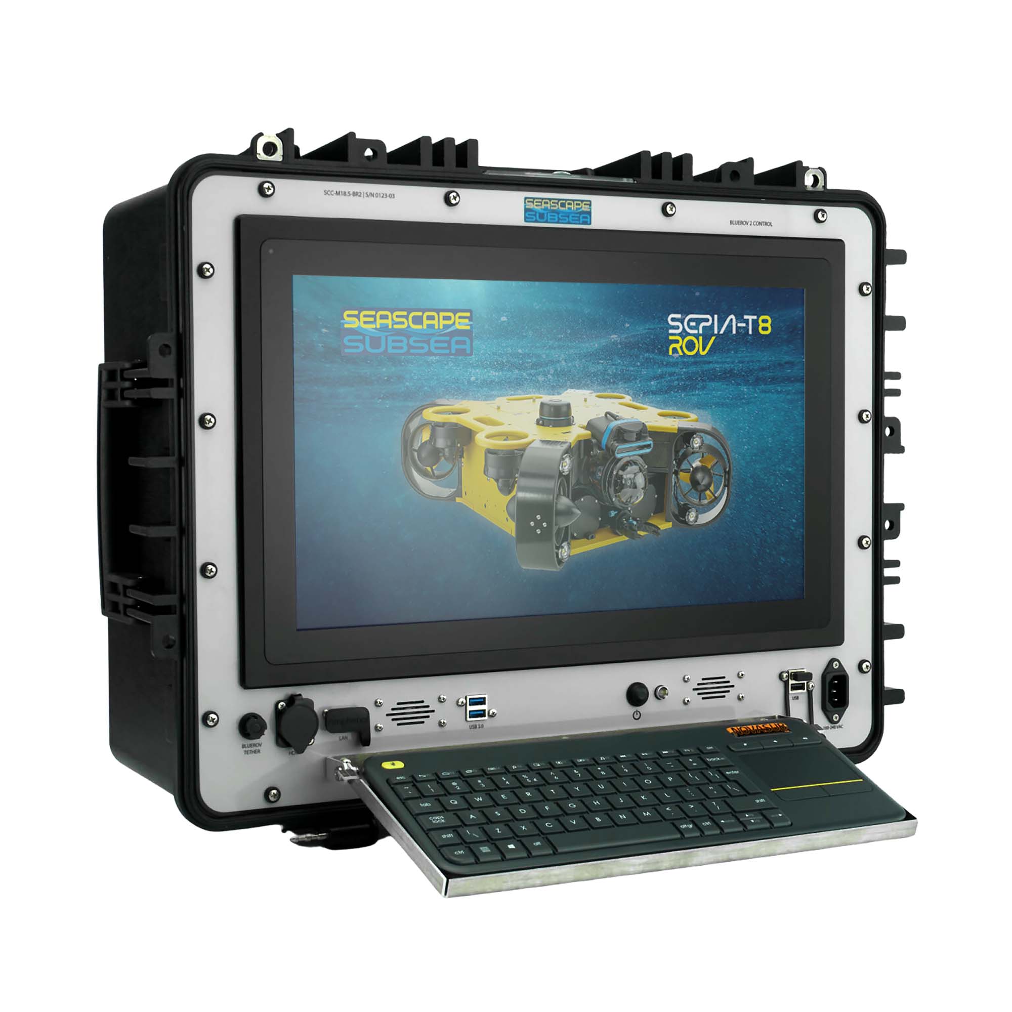 The ROV Control Case for SEPIA-T8 or BlueROV2 is a portable and robust solution for operating and monitoring ROV missions. Designed for field use, it integrates a high-performance PC, a sunlight-readable 18.5-inch touchscreen monitor, and an intuitive wireless keyboard with a built-in mousepad. The system ensures seamless ROV control with a Fathom-X tether interface, reliable power options, and a built-in UPS function for uninterrupted operations.